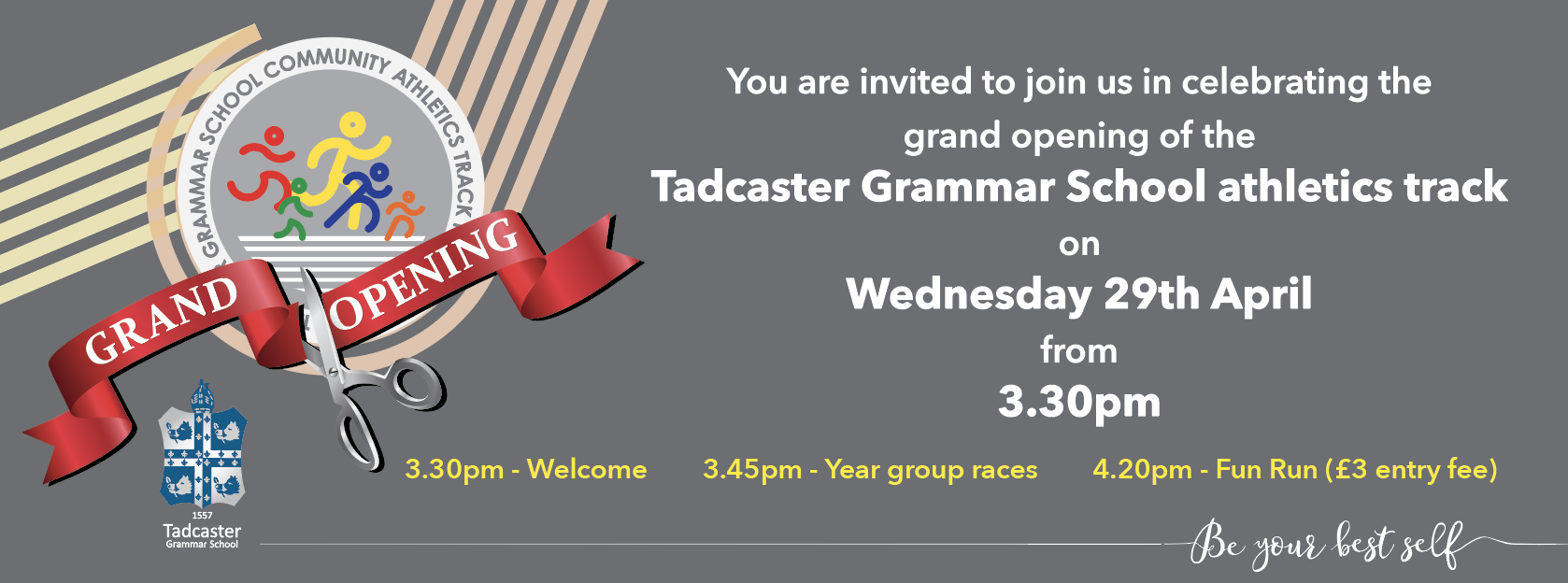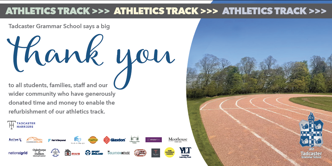The celebrations begin at 3.30pm with a welcome and official ribbon cutting to open the track followed by TGS student year group races (organised by Mr Solk and the PE team). A community fun run mile will then take place from 4.20pm (£3 per person entry fee) – thank you to our project partners Tadcaster Harriers for organising this. All participants will receive a medal for taking part in the community fun run.